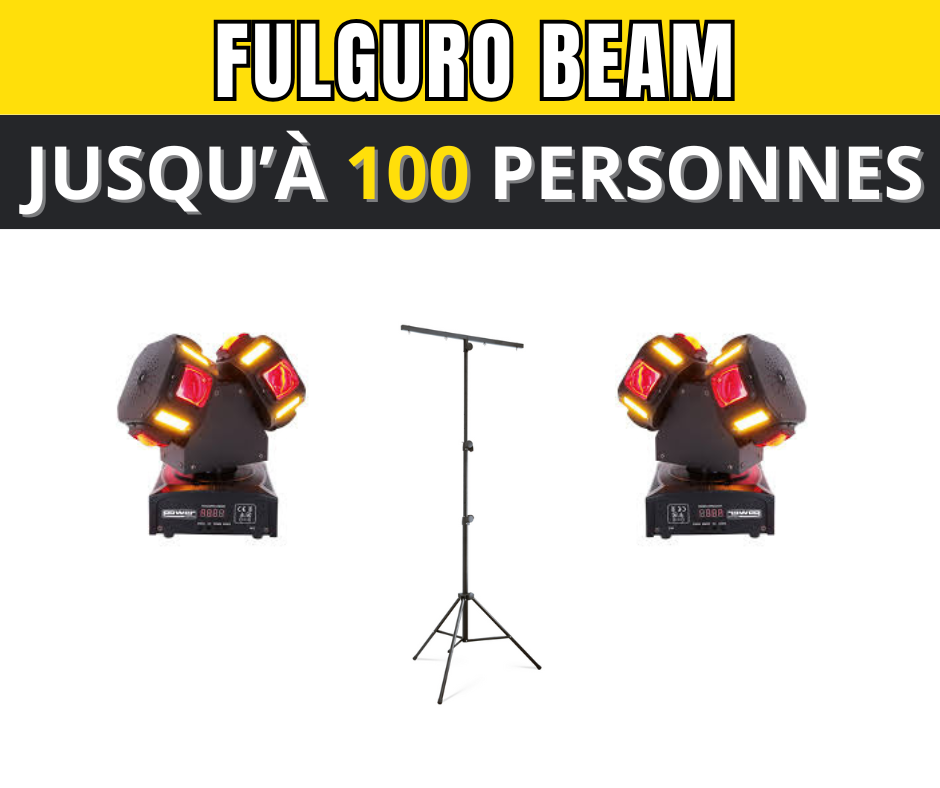 Besoin d'un peu de lumière pour faire vos soirées ? Vous êtes entre 60 et 100 personnes ? Alors ne cherchez plus, retrouvez notre pack avec un pied en T et deux jeux de lumière rotatifs Fulguro Beam !
