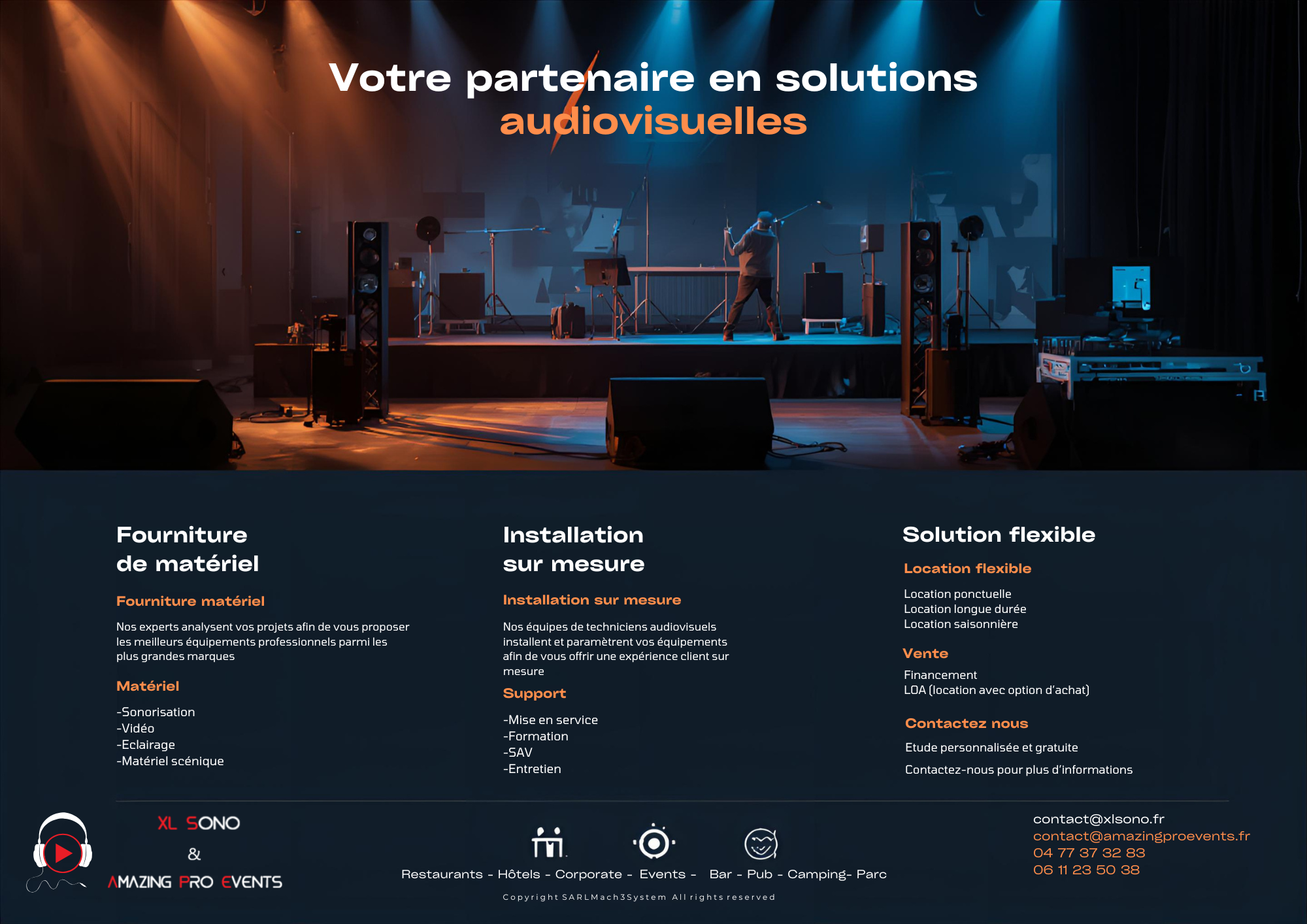 Revendeur et intégrateur de matériels audiovisuels de grandes marques dans les domaines du son, de la lumière, de la structure et de la vidéo Notre équipe vous accompagne de l'étude à l'installation de votre projet et réalise la maintenance de vos équipements.