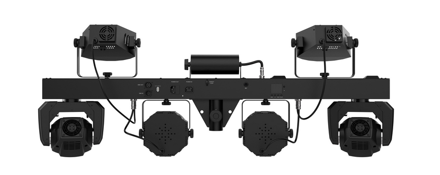 système 5-en-1 qui regroupe des lyres automatiques, des derbies, des washs, un laser et un effet de strobe, tous prémontés sur une seule barre